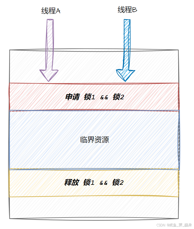 假设存在两个线程(线程A和线程B)需要协同操作两个共享资源(锁1和锁2):