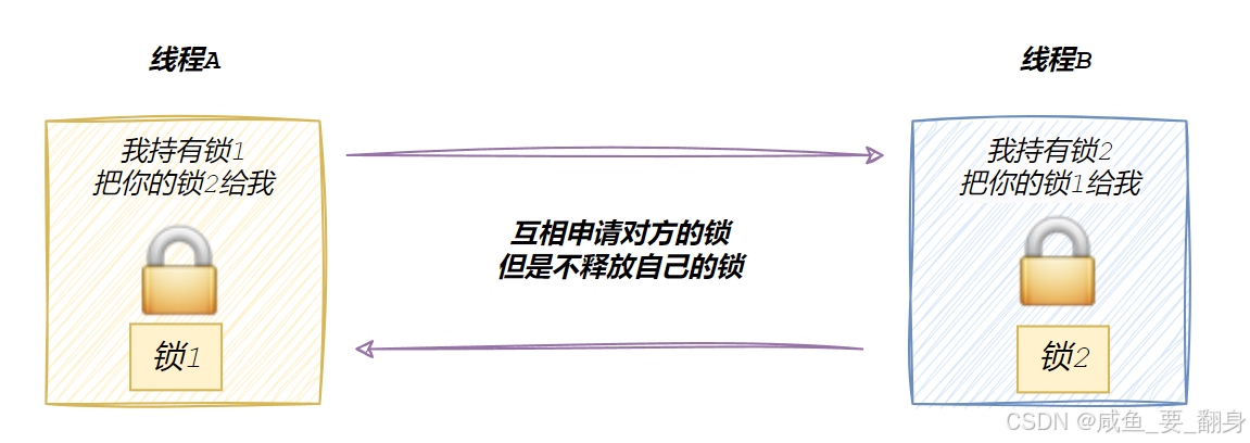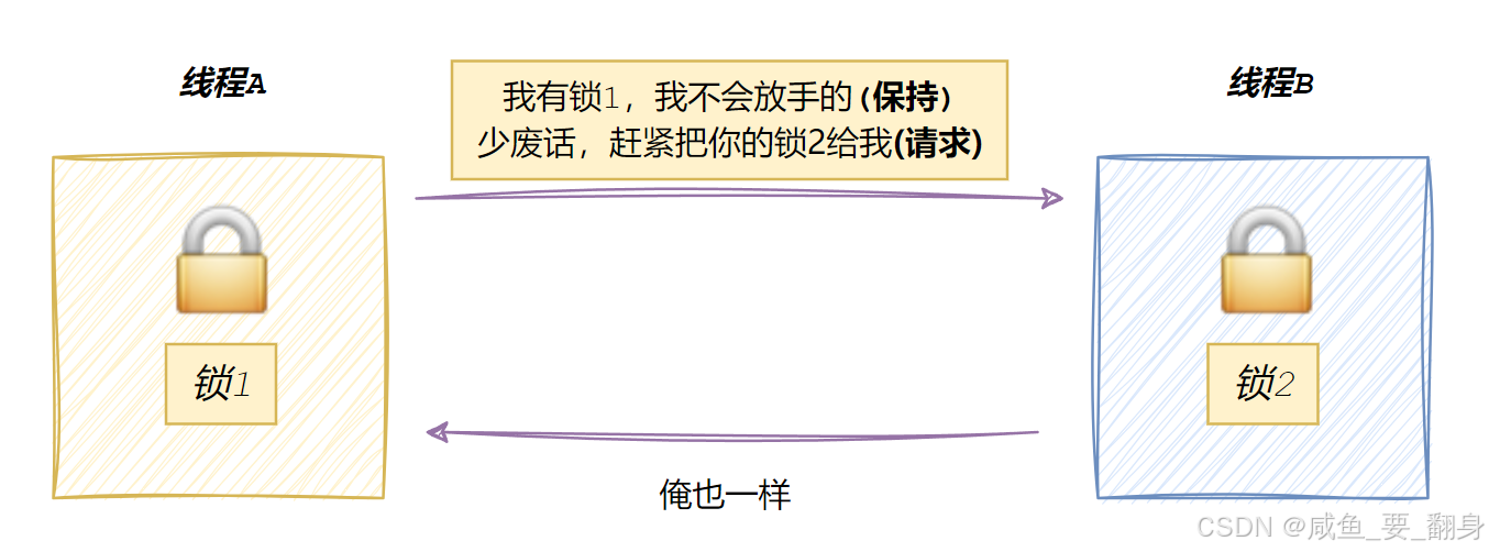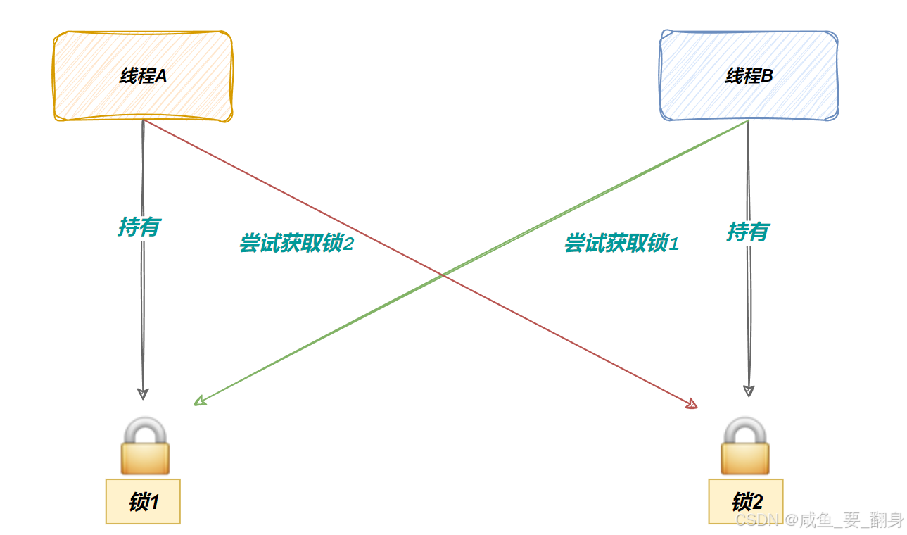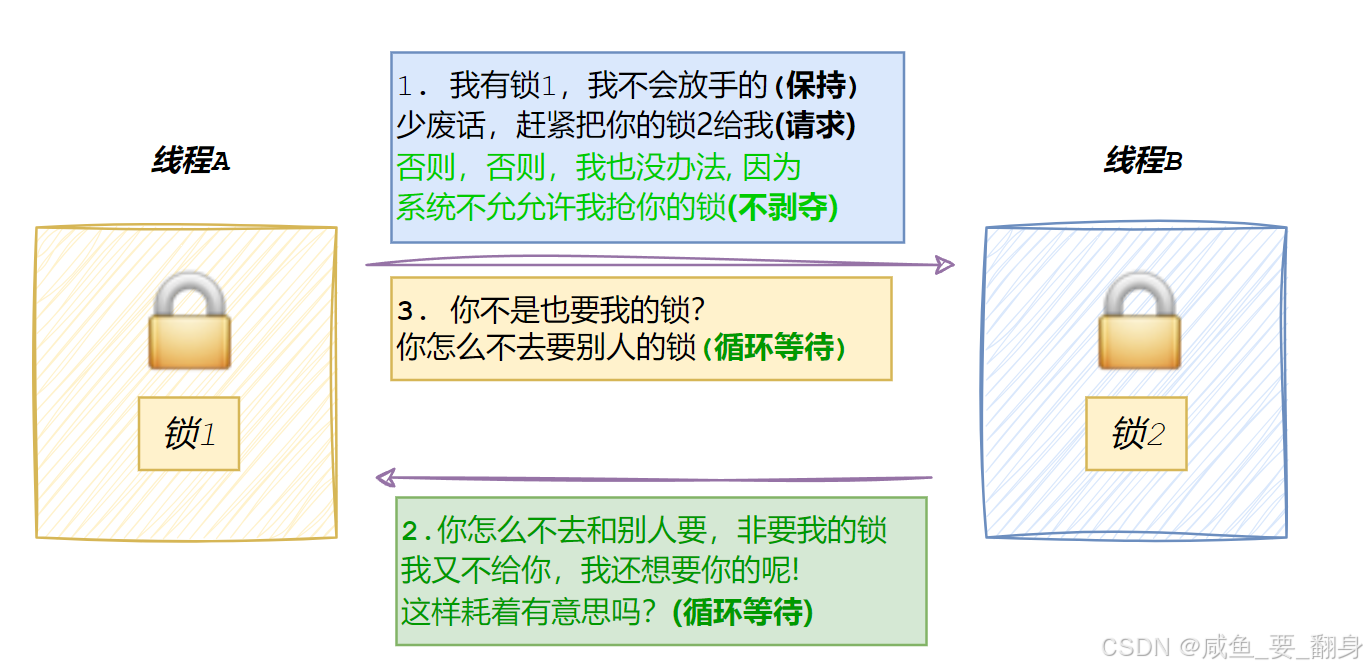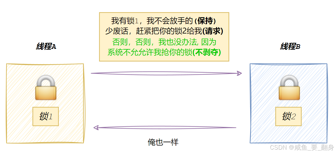 此时线程A等待线程B释放锁2,线程B等待线程A释放锁1