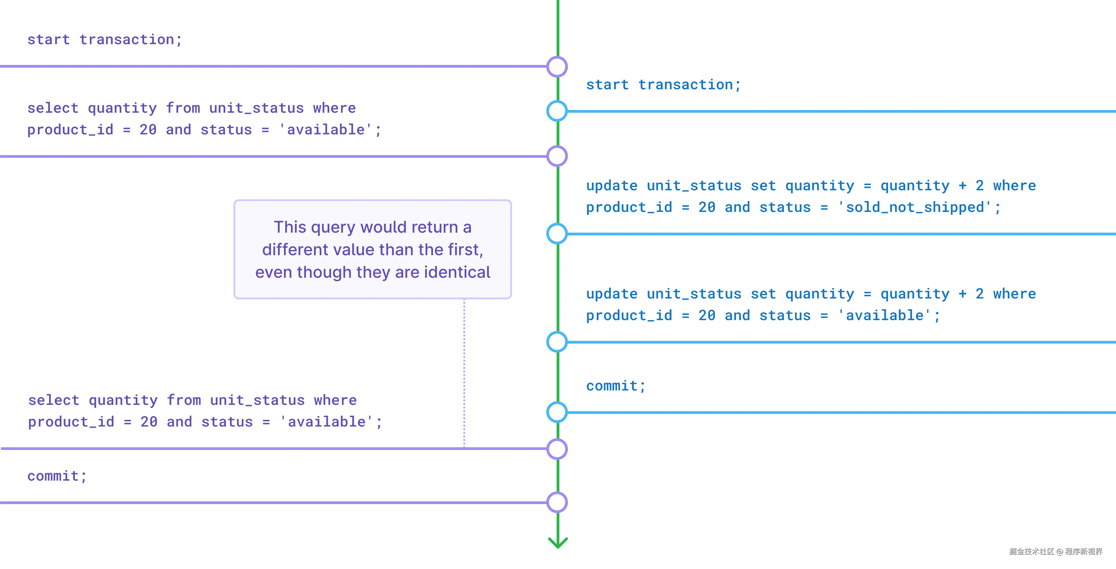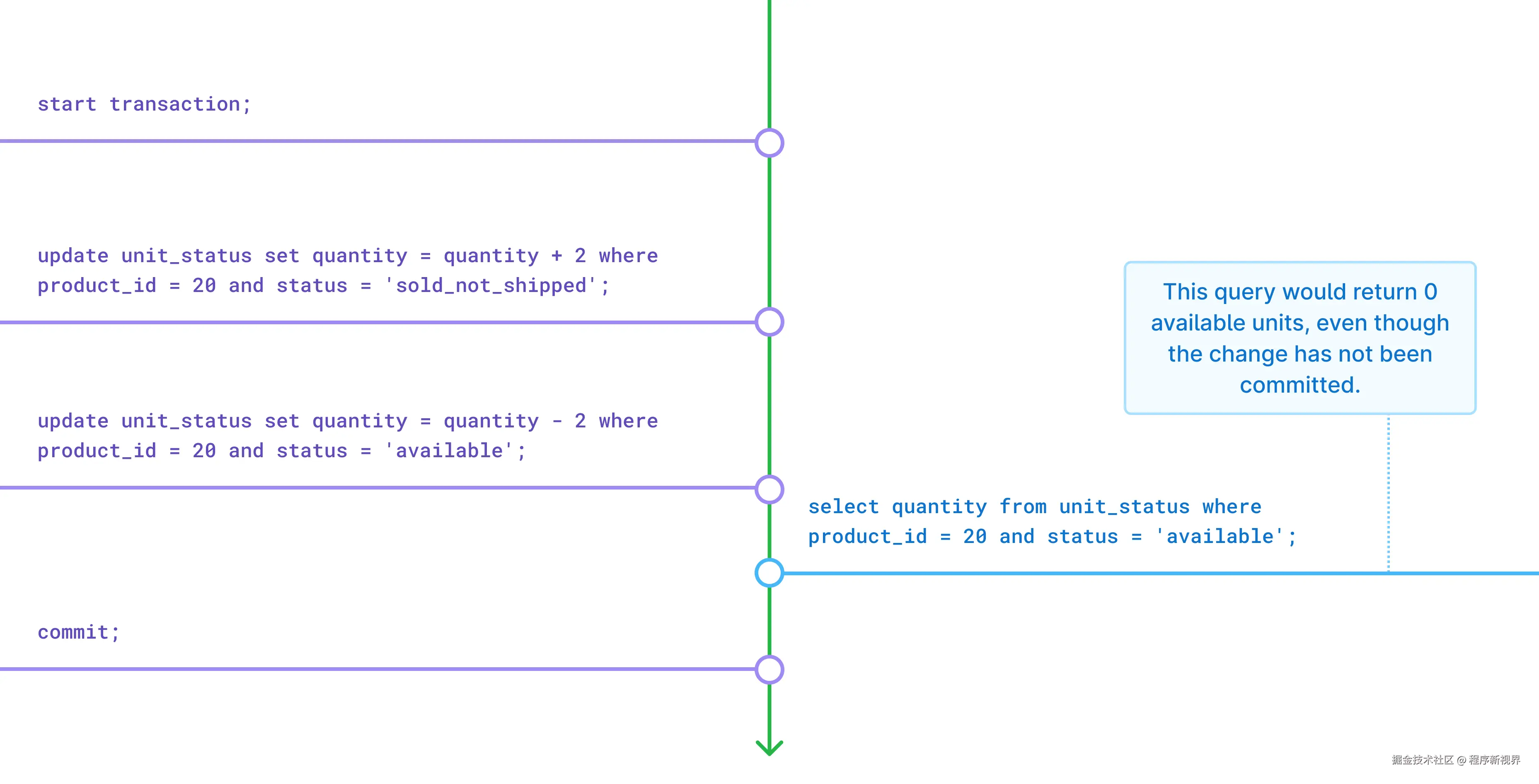 从表面上看,这似乎不是问题,因为数据库反映了unit_status表中的两个记录修改。但如果事务最终回滚而非提交,则之前返回的数据将会不准确,因为更改已被撤销,但客户看到的信息却没有更新。