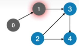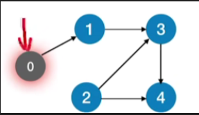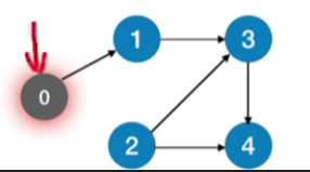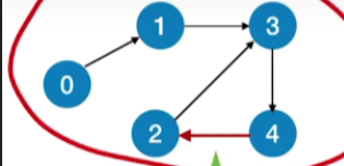 - 有环图的情况:加入函数调用栈的顶点初始都是正在访问的状态,如上图的函数调用栈最终为:0->1->3->4->2,接下来访问的是3,发现3已经在访问中,因此判断出存在回路,退出循环