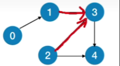 - 0号顶点的入度为0,1号顶点的入度为1,然后2号顶点的入度为0,3号顶点的入度为2,4号顶点的入度为2