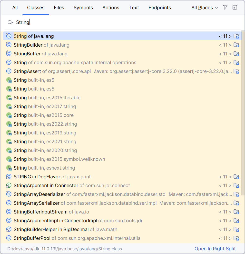 Ctrl + N:打开全局类搜索框,可搜所有 JDK、引入 Jar 里的类,是真正意义上的全局搜索,如搜 String,显示的是 JDK 中的 String 类