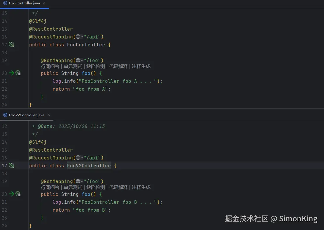 假设FooController控制层给自己用,使用8081端口,并加前缀a。而FooV2Controller给合作商用,使用8082端口,并加前缀b。