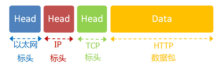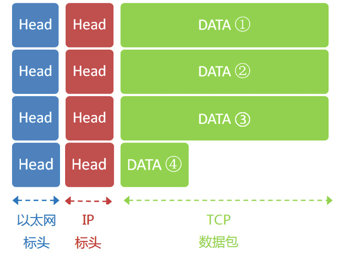 [TCP头]+ 应用层数据 -> TCP 段 (Segment)[IP头]+ TCP 段 -> IP 包 (Packet)[帧头]+ IP 包 +[帧尾]-> 以太网帧 (Frame)