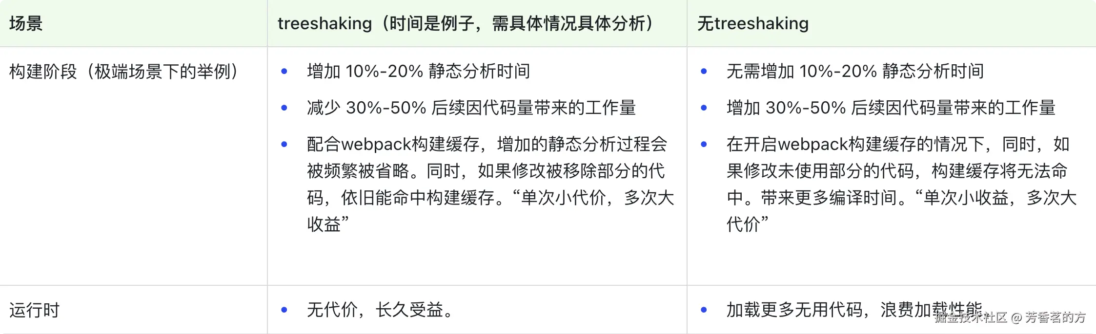 treeshaking在性能方面,是一把双刃剑,需要权衡。虽然treeshaking带来了编译时的额外工作量,但在后续编译和代码生成时,可能会带来更多性能节省。也就是说,treeshaking带来的额外工作量,相比后来能节省的工作量来说,性价比可能更高。