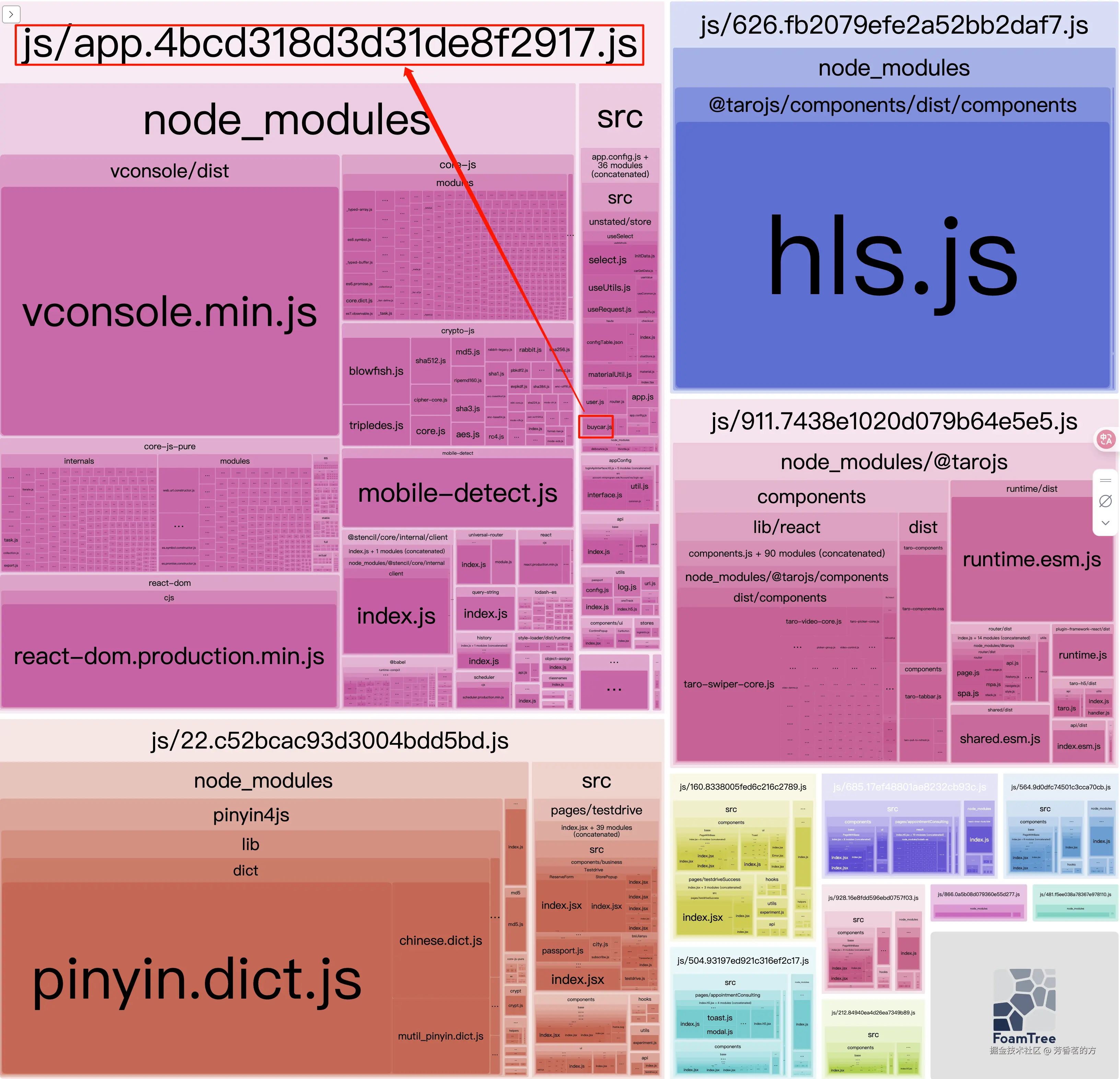 例如我修改了我项目中的 buycar.js,根据下面chunk分析图来看,涉及的重编译范围就是整个 js/app.4bcd31...js 这个chunk,但实际上改变的只有buycar.js这个module,其他的诸如unstated下的js module都没改变,按理说没必要对整个chunk下的每一个module都重新打包。