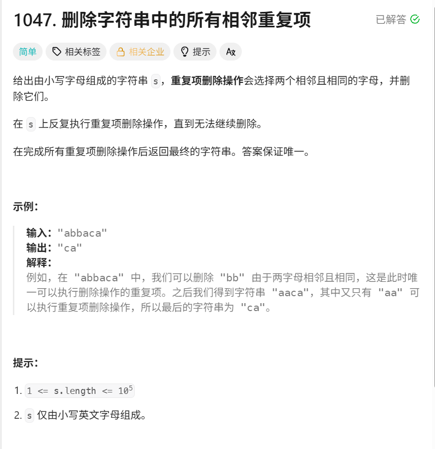 一. 力扣 1047. 删除字符串中的所有相邻重复项