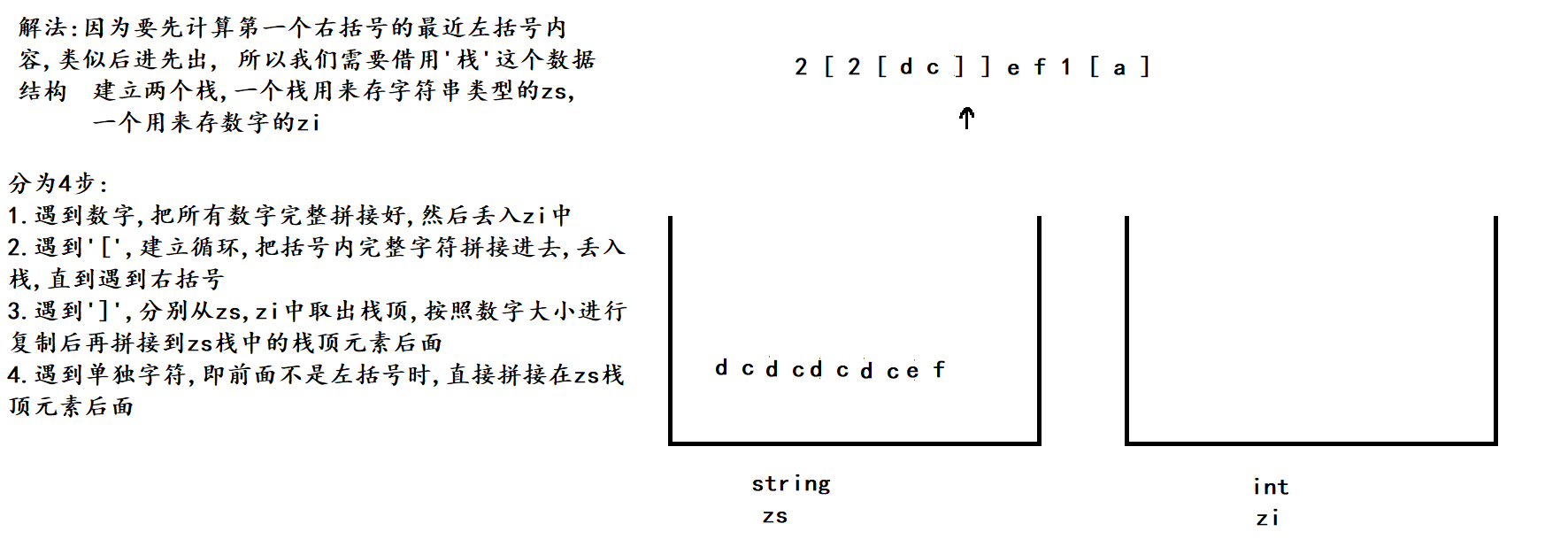 类似于加括号的计算器运算, 这里也是先计算括号里面的, 但不同的是括号中的是字母,我们要根据括号外面的数字字符,来进行对应次数的复制