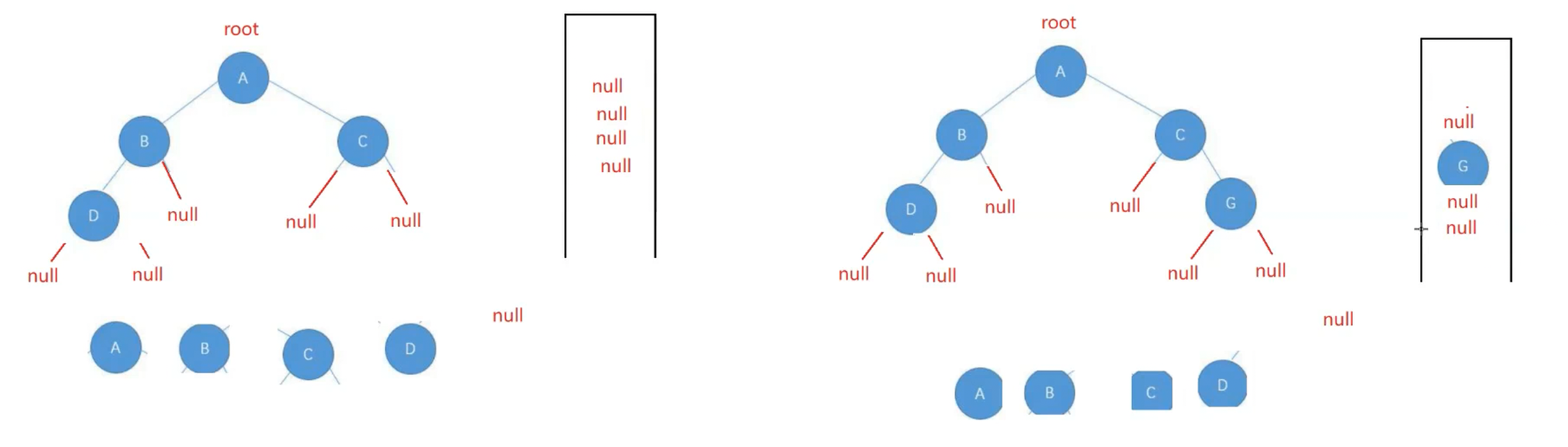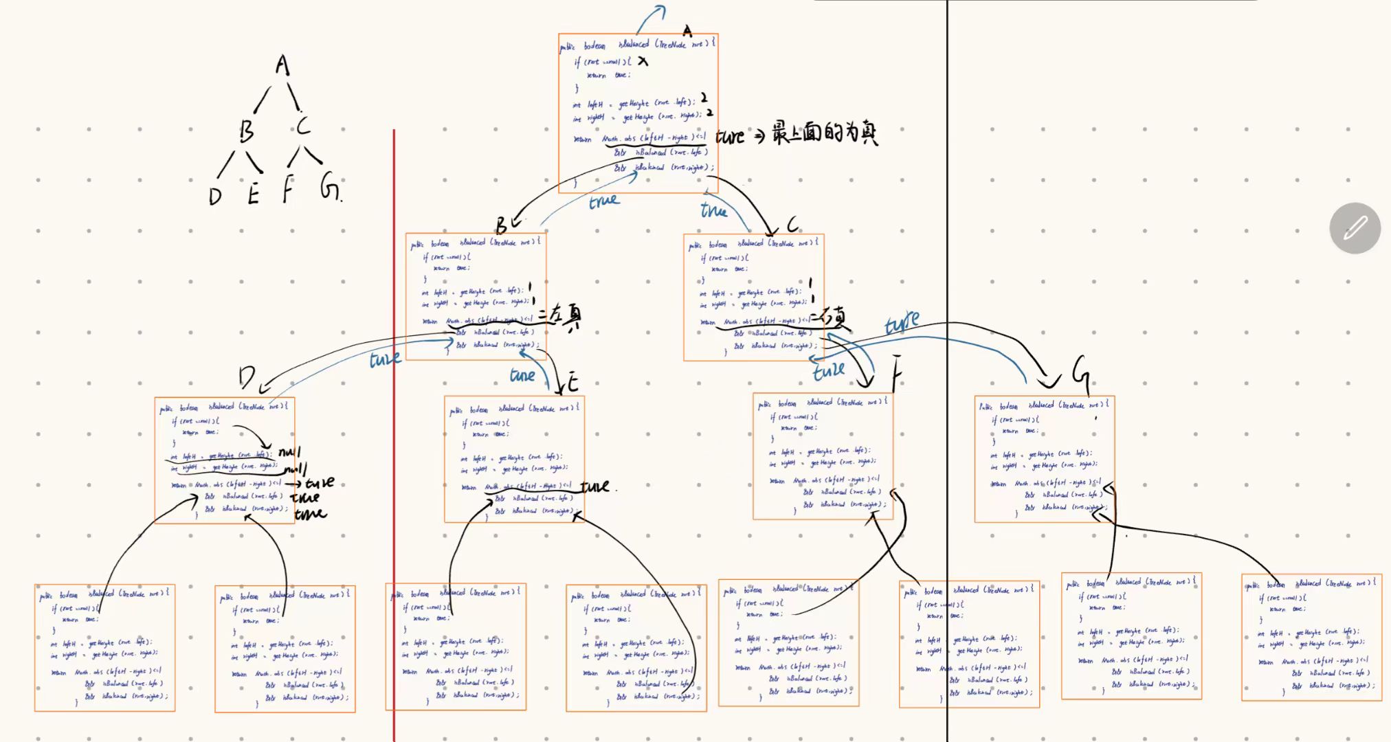 1.比如到达E,E2时候判断,e.l = e2.r = null 返回true. e.r = e.l = null - 返回true true&&true --->return true给到上一层