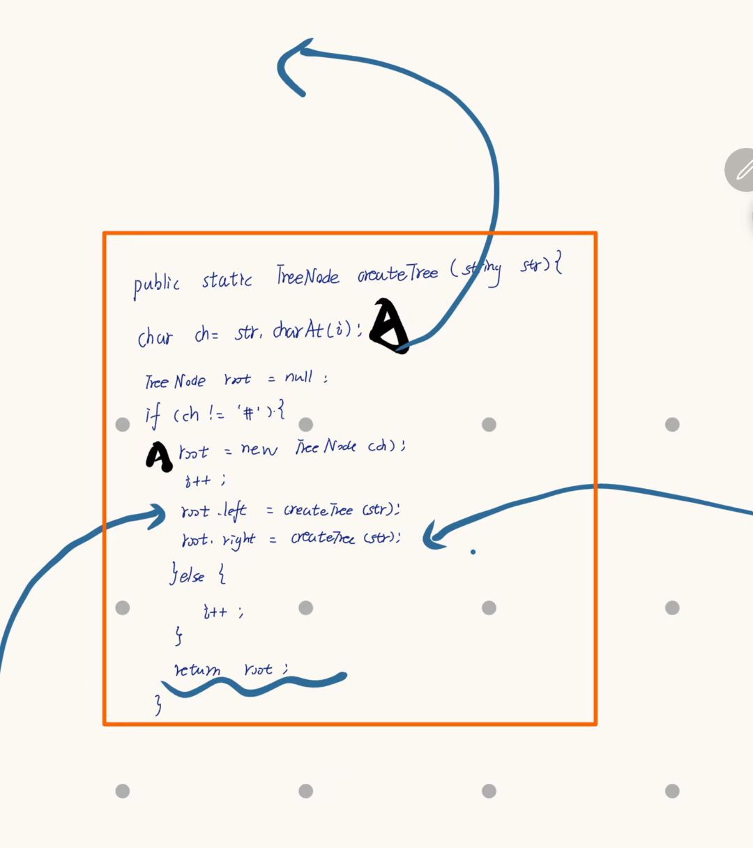 到这里你可能存在一个疑问就是,你都是在创建节点,并没有进行节点之间的链接,怎么能够创建成为一颗树呢?在下面的代码调试中你会发现在返回的时候已经开始从底部一点一点的进行链接了~
