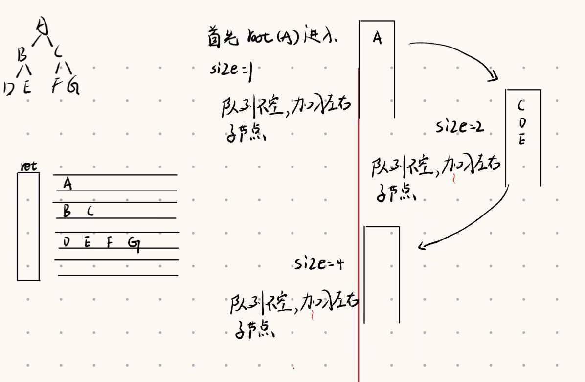 首先创建一个新的二维队列ret,我们之后的每一层就是要放在这里面的.创建一个普通的链表,来存放每一层的具体元素.