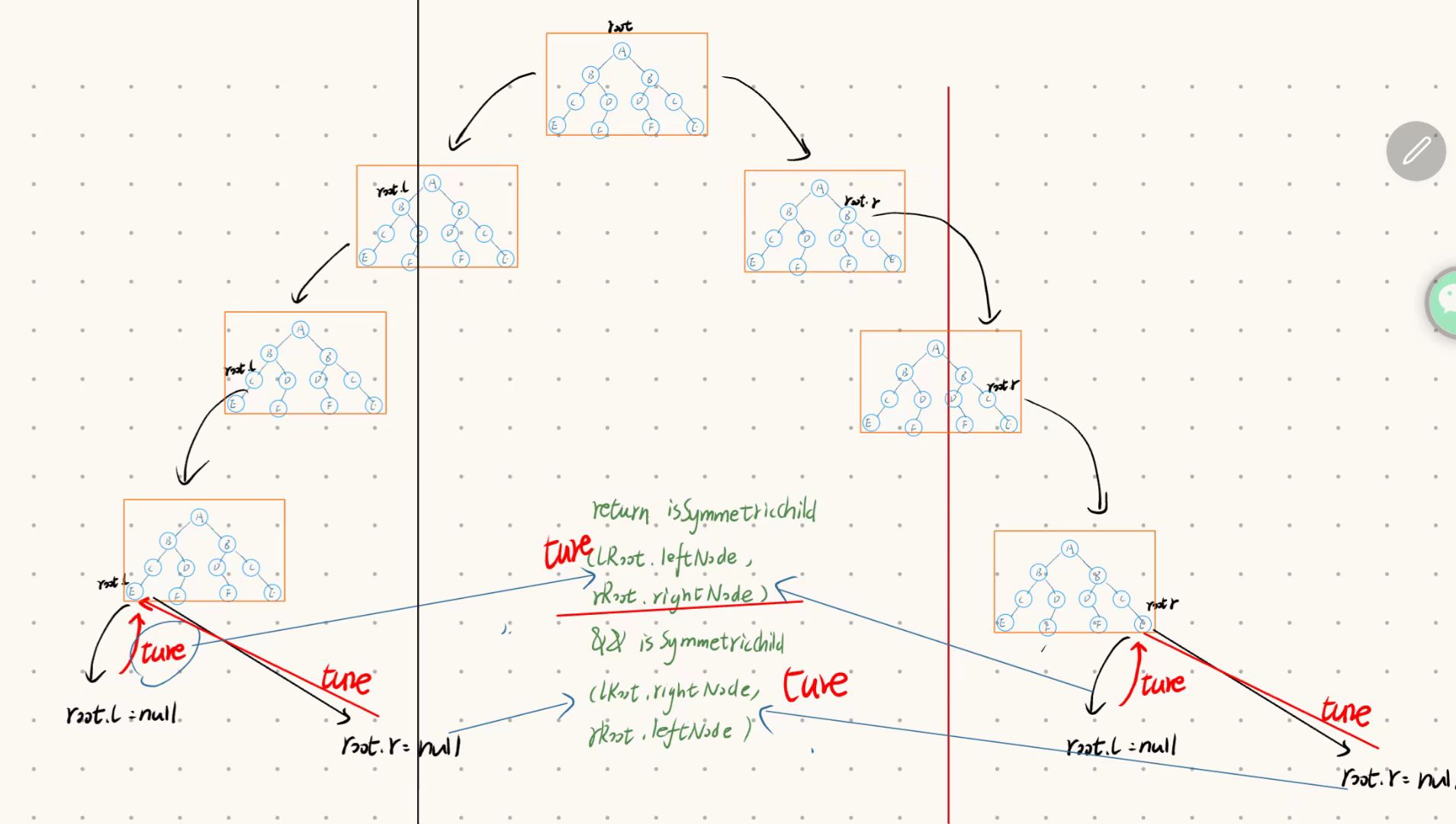 isSymmetricChild(lRoot.leftNode,rRoot.rightNode)是真的,在进行下一部分&& isSymmetricChild(lRoot.rightNode,rRoot.leftNode),我们知道都是null,返回当然为true.这时候两个部分都为true 自然会返回true true&&true --->return true给到上一层.