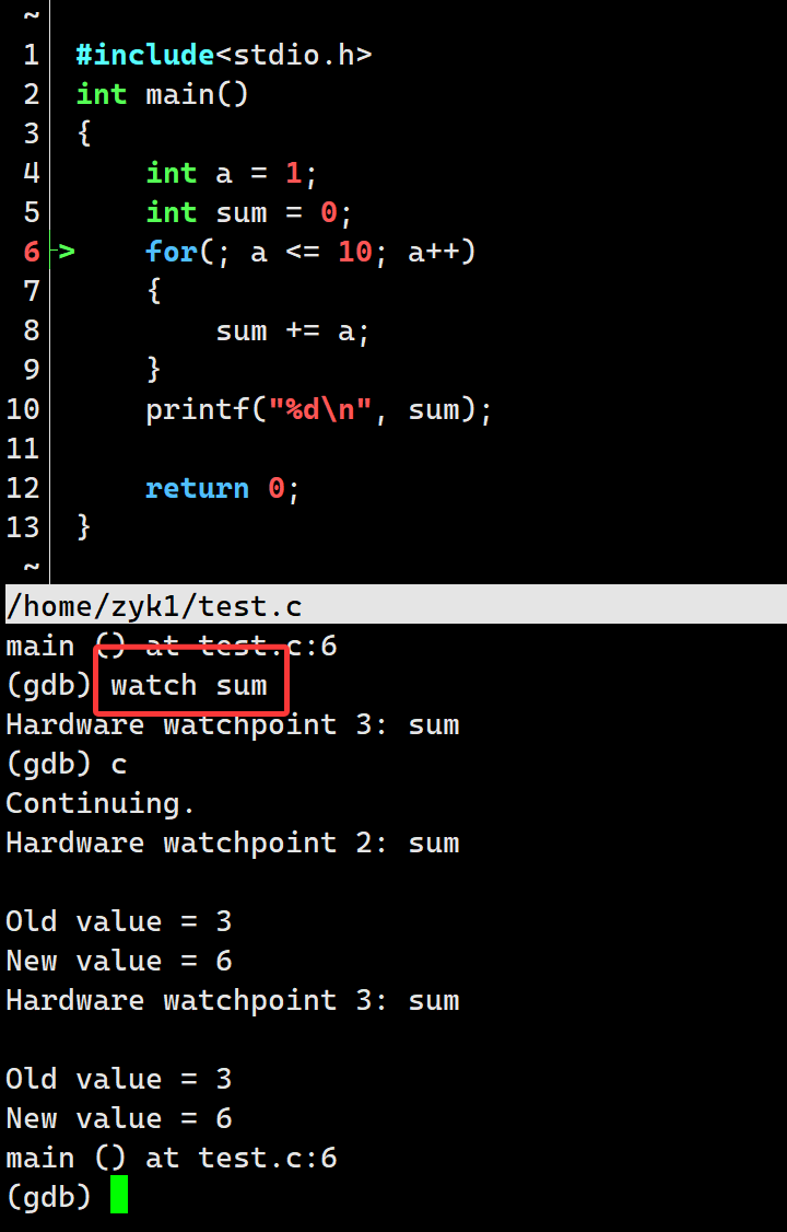 watch 变量:监视一个变量的值,如果该变量的值在程序运行期间发生变化,cgdb会暂停程序的执行并通知用户。这一命令常用在,如果有不应该被修改的变量,你怀疑他被修改了,就可以watch他。