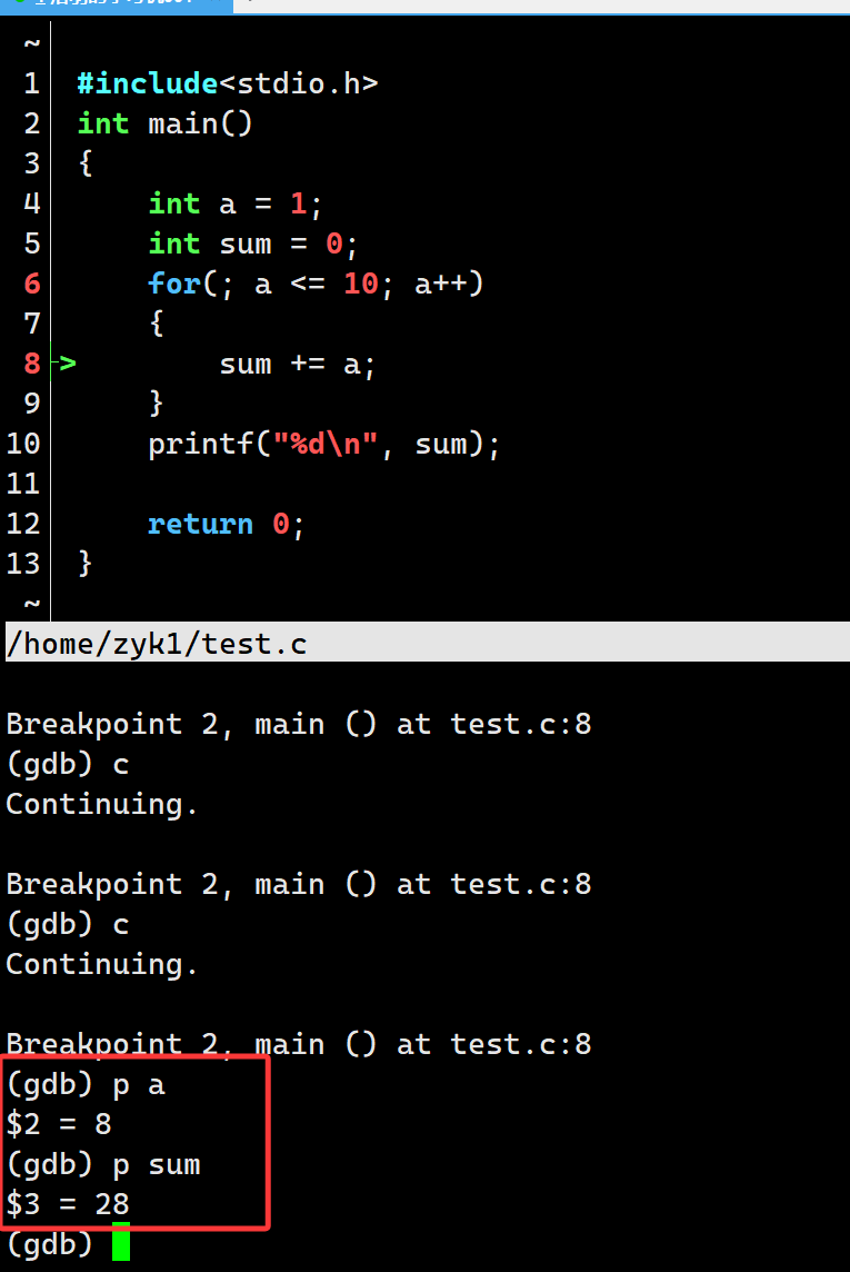 但是,实际开发中要靠自己显式出代码,还是很麻烦。因此cgdb诞生了,cgdb是gdb的前端界面增强版本,能够直接将代码显示在屏幕上面,初次之外其他命令操作没有区别: