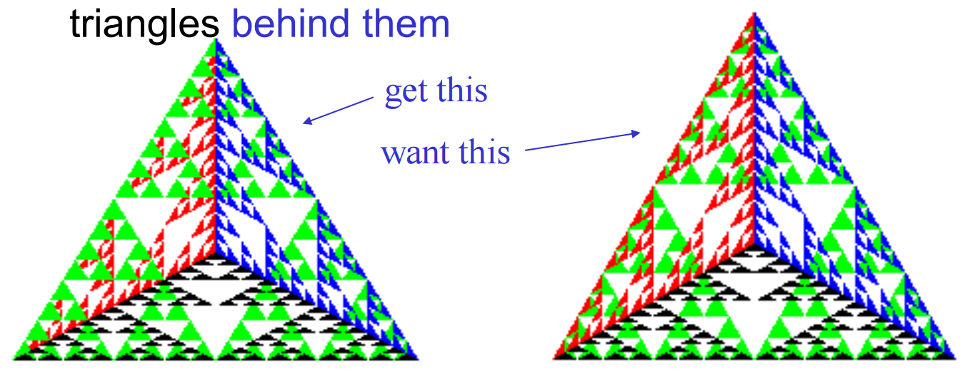 4、不过在三维中,由于三角形是按照程序中的定义顺序绘制的,因此前面的三角形并不总是渲染在它们后面的三角形前面,这涉及了遮挡/消隐问题:
