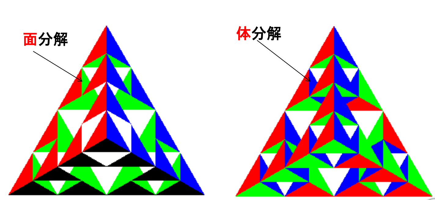 上述算法是A1 gasket 2D Sierpinski Gasket Using Randomly Selected Vertices,而对于A2 Sierpinski Gasket 2D ,先从一个三角形开始,连接三边的中点并去掉中间的三角形,再重复上述过程。对于A2的分形效果,我们考虑填充区域(黑色)和周长(围绕填充三角形的所有线的长度):随着我们继续细分,面积变为零但周长趋于无穷大,这不是一个普通的几何对象(既不是二维也不是三维)、而是一个分形(分形维数)对象(例如英格兰海岸线为1.02维)。