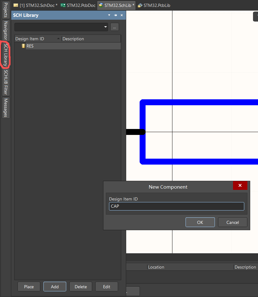创建完一个原理图库的元件后,可以点击add继续添加新的元件,比如创建电容元件CAP