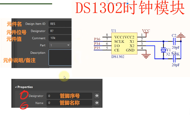 这里以右侧的DS1302时钟模块来说明元件属性和管脚属性。图中的DS1302就是元件名,U1、Y1、C2、C3这些就是元件位号,20pF,32.768K这些是元件值。