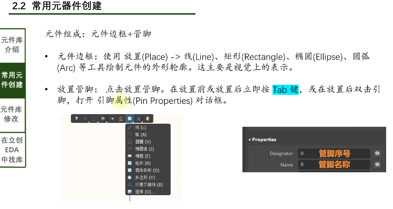 元件组成包含边框和管脚,边框一般有线、矩形、圆弧等等