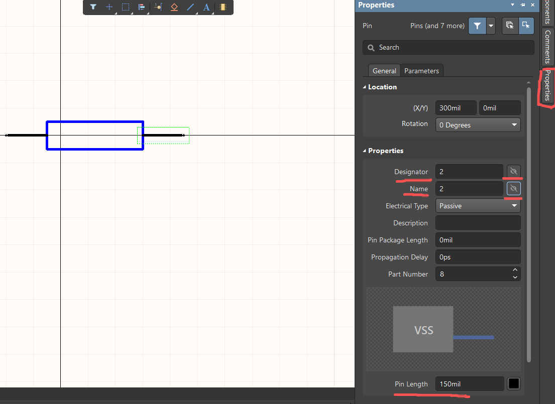 点击管脚,在右边的properties里面,可以设置管脚的序号和名称,及是否隐藏序号和名称,修改下面的pin length,可以修改引脚的长短。