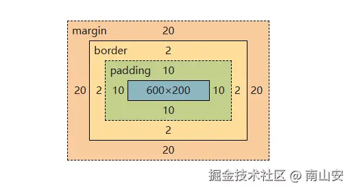 实际占位宽度:600px + 20px×2 = 640px内容区域宽度:600px - 10px×2 - 2px×2 = 576px