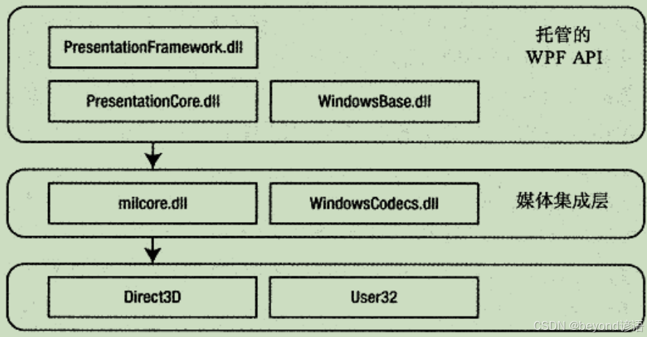 PresentationCore.d 包含了基础类型,如 UIElement 类和 Visual类,所有形状类和控件类都继承自这两个类。如果不需要窗口和控件抽象层的全部特征,可使用这一层,而且仍能利用 WPF 的渲染引擎。