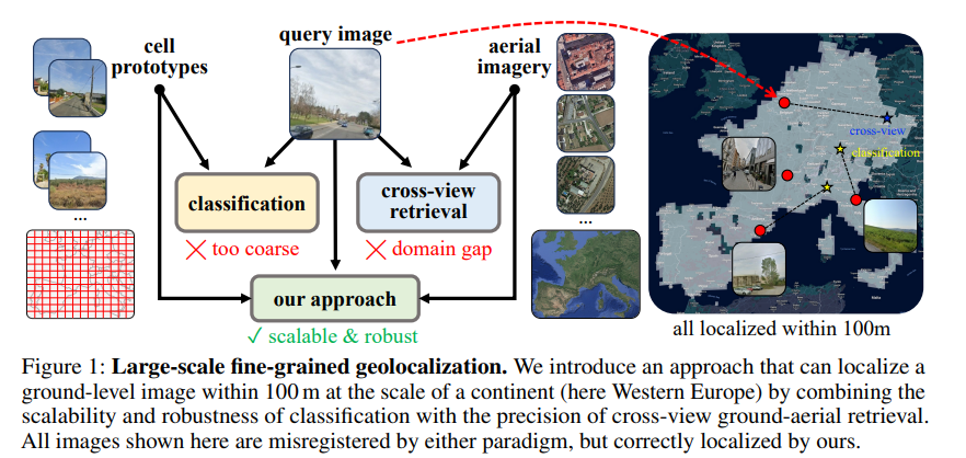 亮点:提出混合地理定位方法,通过代理分类任务学习位置编码特征,结合航空影像嵌入解决地面数据稀疏问题,实现欧洲大范围区域内68%以上查询的200米精度定位,突破大陆级细粒度定位瓶颈。