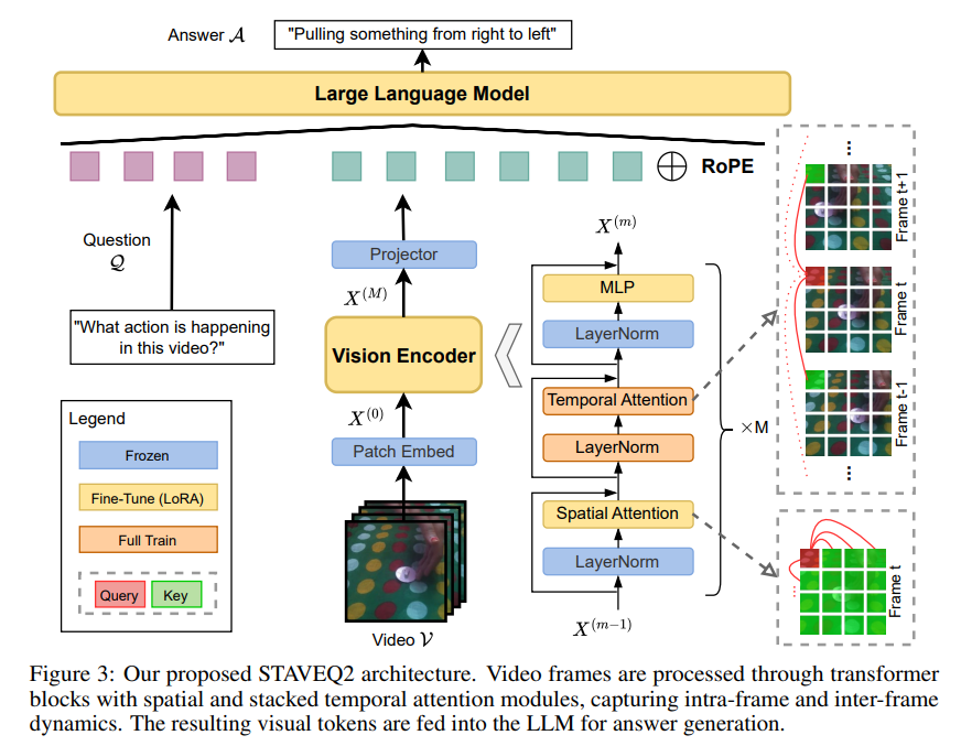 亮点:在视觉编码器中引入堆叠时序注意力模块,解决Video-LLM对动作序列和时间进展的理解缺陷,在VITATECS、MVBench等基准测试中性能提升高达5.5%,显著增强视频问答与动作识别能力。