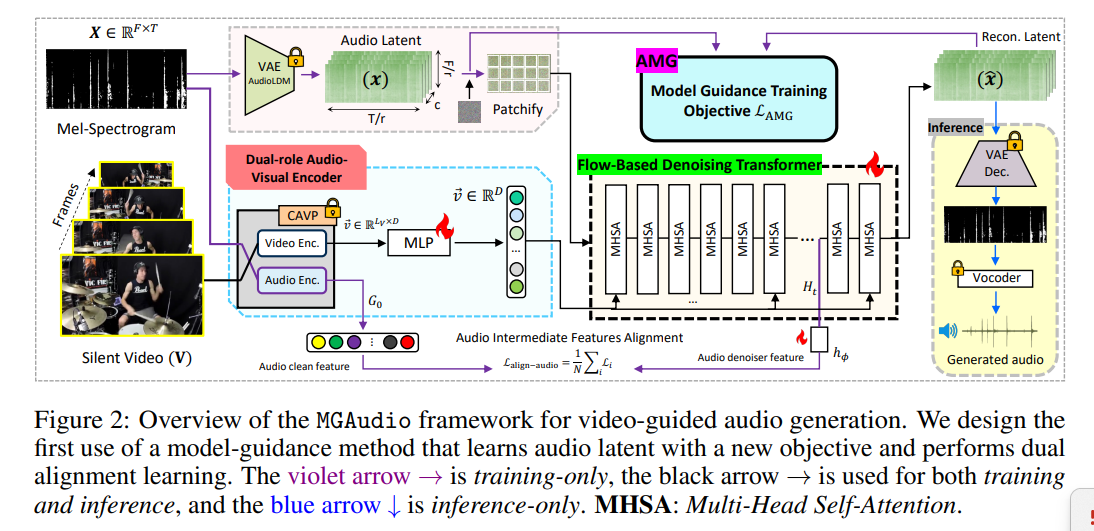 亮点:提出流基框架MGAudio,通过模型引导的双角色对齐机制,实现生成模型自引导优化,在VGGSound数据集上将FAD降至0.40,显著超越现有方法,且在UnAV-100基准中表现出强泛化性。