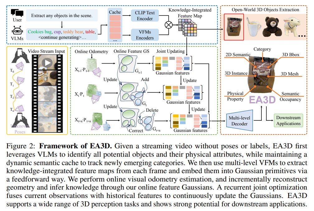 亮点:提出统一在线框架EA3D,融合视觉-语言与2D视觉基础编码器,通过高斯特征图在线更新与循环联合优化,实现流式视频中3D目标提取、几何重建与语义理解的同步完成,支持多下游任务。