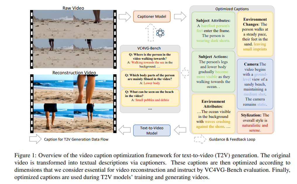 亮点:提出面向文本到视频生成的字幕优化框架VC4VG,构建多维度细粒度评估基准VC4VG-Bench,通过优化字幕质量显著提升T2V模型生成的连贯性与指令对齐度。