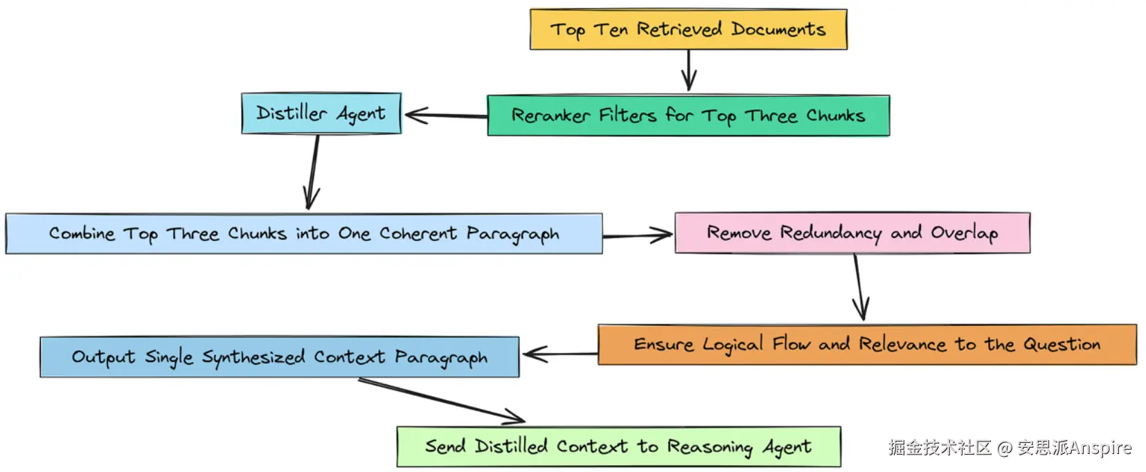 第三阶段(综合):最后,我们将创建一个蒸馏器代理,将排名靠前的文档压缩成一个简洁的上下文段落,供下游代理使用。