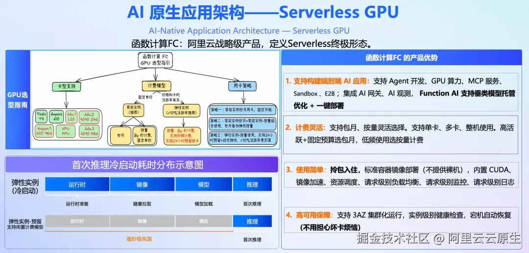 稀缺卡型预留、闲置能力优化成本: 通过预留实例可以保证刚性交付,有请求正常收费,无请求提供 FC 平台侧的闲置能力进一步优化成本,仅保留内存和显存状态,费用降至正常水平的 10% 左右。