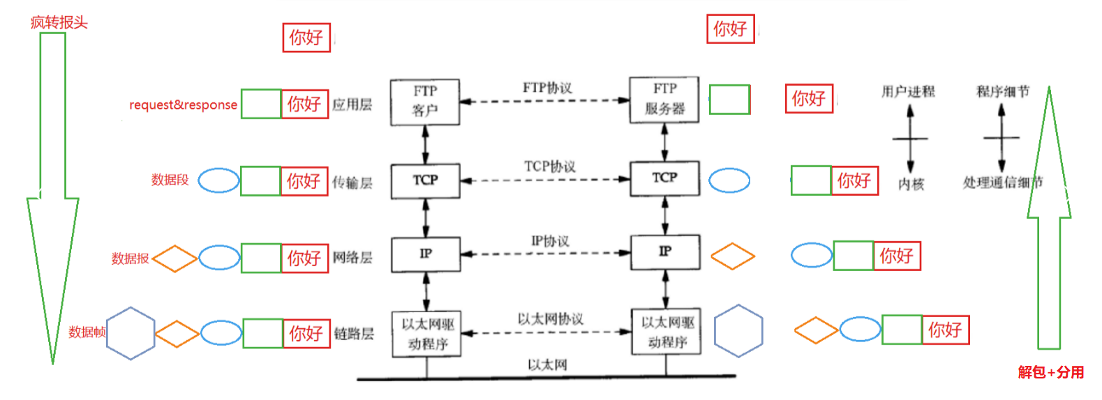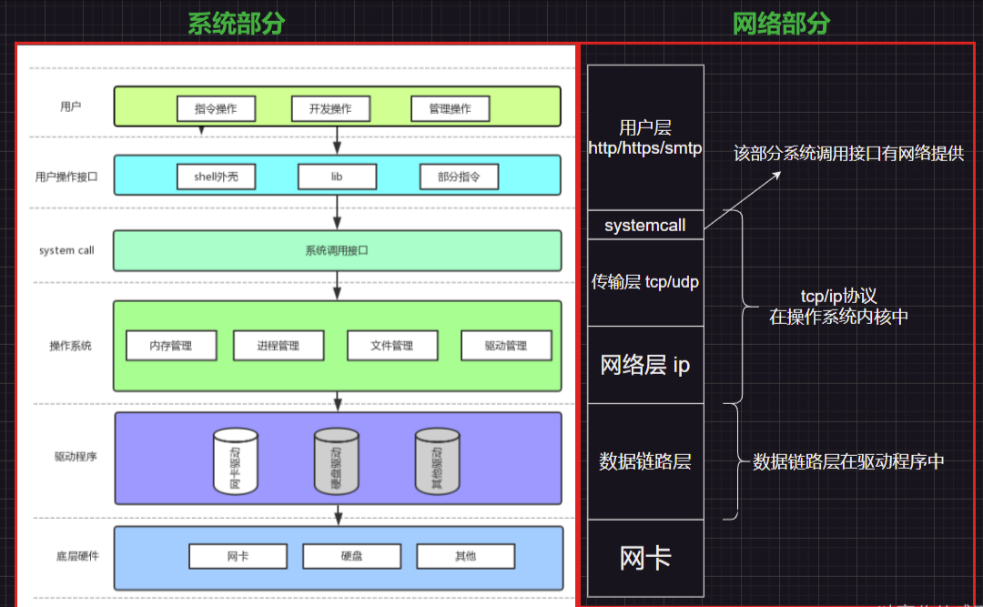 当然,应用层也是在操作系统中实现的,只不过不是在内核中实现的。数据链路层在驱动程序中,但是驱动程序同时也是操作系统内核的一部分,所以数据链路层也是在操作系统内部实现的。