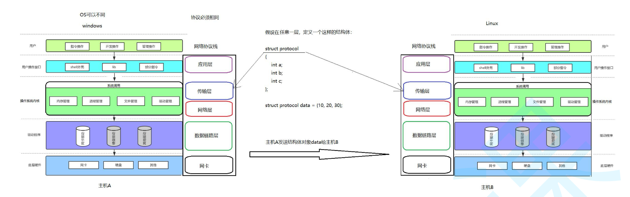 不同的操作系统的内核实现可能差别很大,但对于网络协议的实现是基本一样的,尤其是传输层和网络层!相当于每台计算机都遵循相同的协议,相关的约定,从而保证所有计算机之间都能顺利通信,使得不同操作系统的主机能够进行可靠的通信!