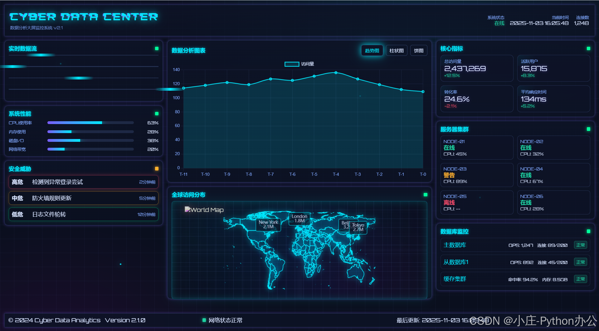 在这个数字化时代,数据可视化已经成为企业决策的重要工具。本项目实现了一个具有赛博朋克风格的数据分析大屏系统,融合了现代Web技术和未来感设计美学,为用户提供沉浸式的数据监控体验。