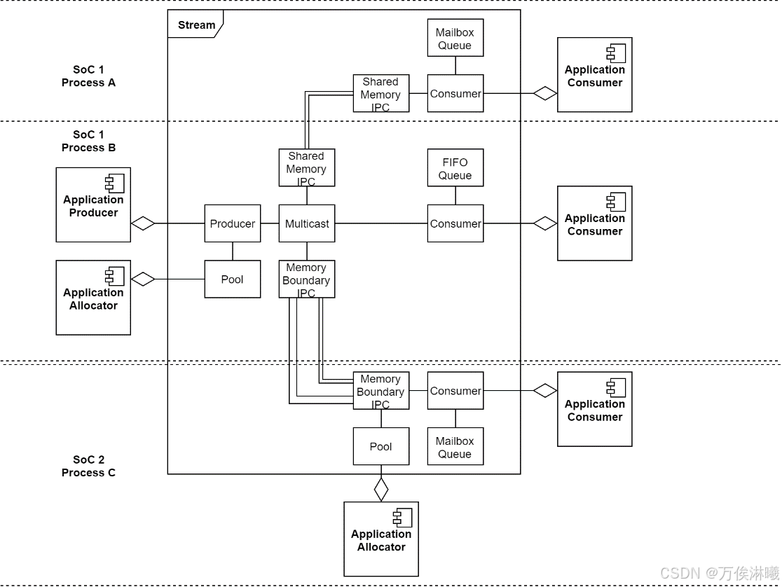构造生产者 (Producer) 和消费者 (Consumer) 模块之间的"流",一个 "包 (packet)" 可含多个"元素 (elements)"------如图像缓冲、张量、元数据。 支持多缓冲 (多 packet)、多消费者、FIFO 模式/Mailbox 模式(最新数据优先)等。支持跨进程 (IPC)、芯片-至-芯片 (chip-to-chip) 通信。