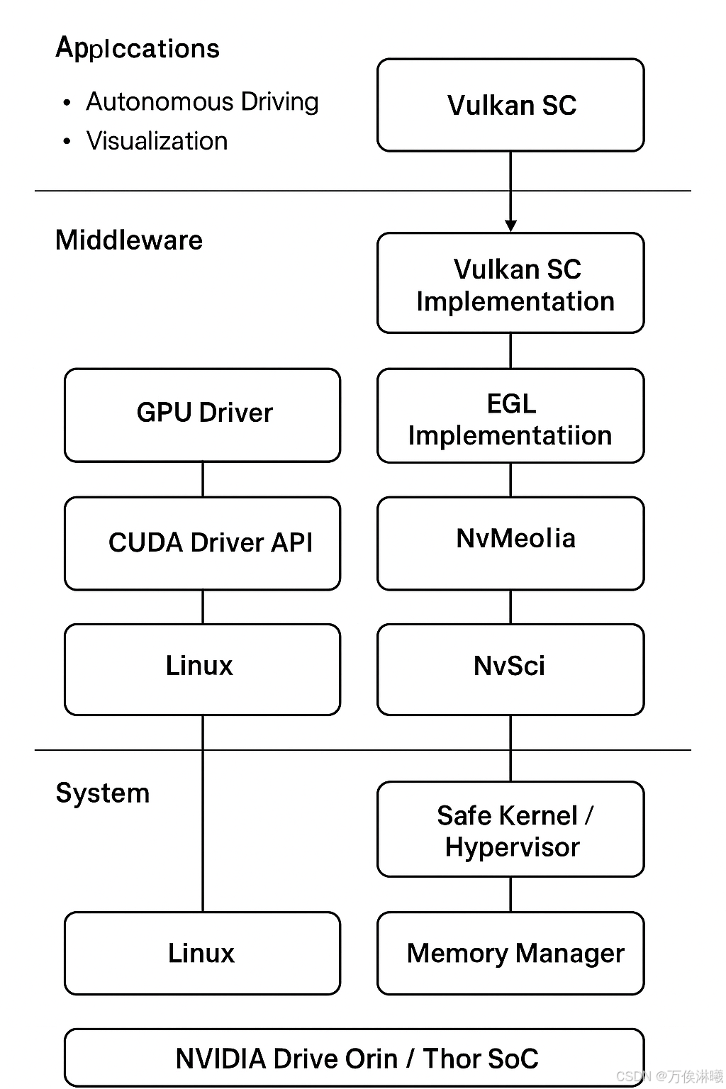 Vulkan SC 是 DriveOS 的安全关键图形 API 子系统。它运行在 DriveOS 的 GPU 驱动栈之上,为安全关键任务(如自动驾驶显示)提供可预测、可认证的 GPU 渲染与计算能力。