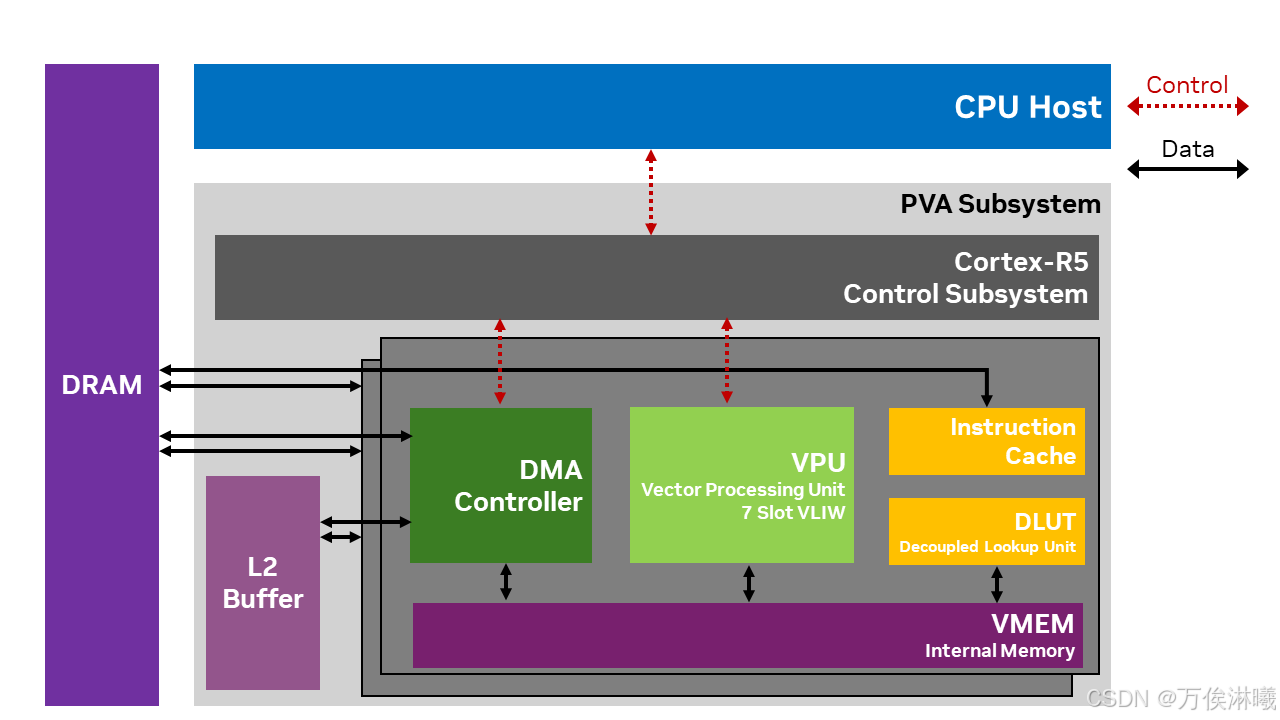 制子系统 Cortex-R5 是 PVA 上运行的任务的主要协调器,也是其外部接口。它与主机 CPU、GPU、其他计算机视觉系统引擎(包括 ISP)以及硬件加速器(例如 NVENC)进行交互。