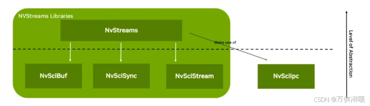 - NvSciStream:建立在前两者之上,用于构造"数据包 (packets)"和"流水线 (streams)"模型,让生产者和消费者模块之间能够交换图像、张量、元数据等。
