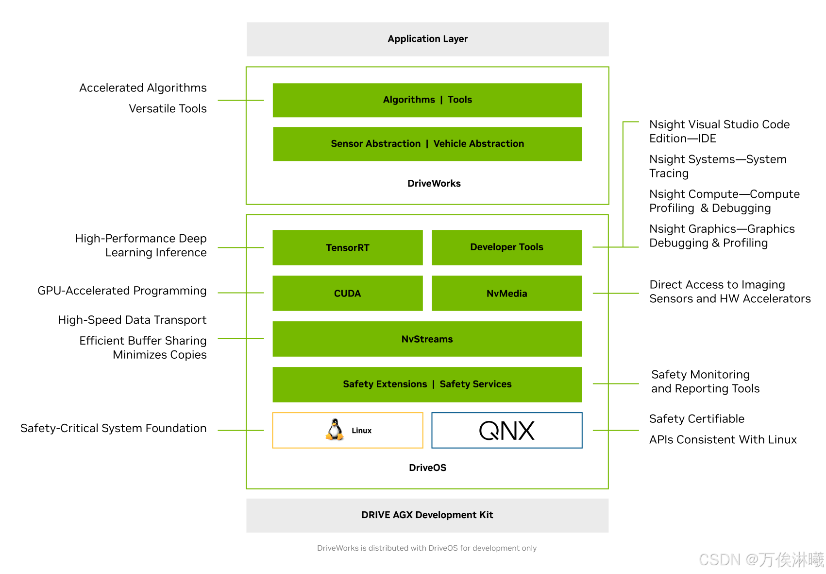NVIDIA DRIVE OS 是专为在基于 DRIVE AGX 的硬件上开发和部署自主应用程序而设计的参考操作系统及相关软件栈。NVIDIA DRIVE OS 为安全关键型应用程序提供安全可靠的执行环境,并提供安全启动、安全服务、防火墙和空中升级等功能。