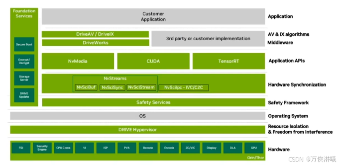 其包含的基础软件栈包括 Type-1 Hypervisor、NVIDIA CUDA® 库、NVIDIA TensorRT™、NvMedia 以及其他经过优化的组件,可直接访问 DRIVE AGX 硬件加速引擎。