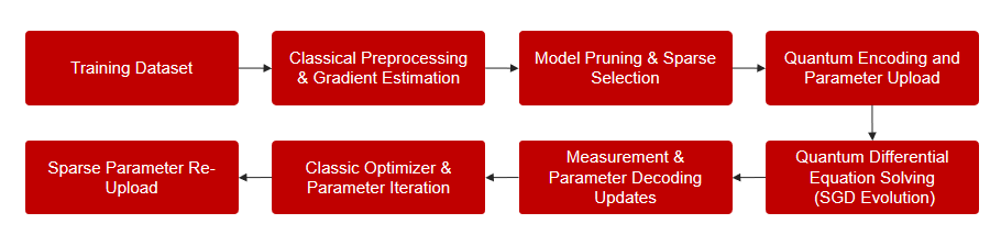 微美全息的创新在于首次建立了容错量子算法与随机梯度下降之间的严格数学对应关系,并在此基础上提出了一种改进的量子求解框架。该框架能够在大规模模型训练中,以量子态的形式加载参数梯度信息,并通过量子态演化来高效模拟梯度更新过程。