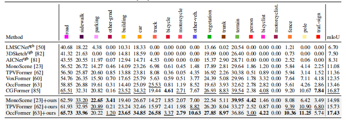在SemanticKITTI上,将MonoScene的mIoU提升3.90,TPVFormer提升4.38