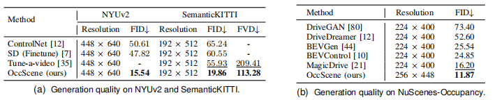 在NYUv2、SemanticKITTI和NuScenes-Occupancy等多个数据集上的实验表明,OccScene在生成质量上显著优于现有方法: