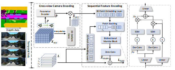 **序列特征编码:**使用双向Mamba块沿深度维度处理语义占据特征,沿时间维度处理潜在特征