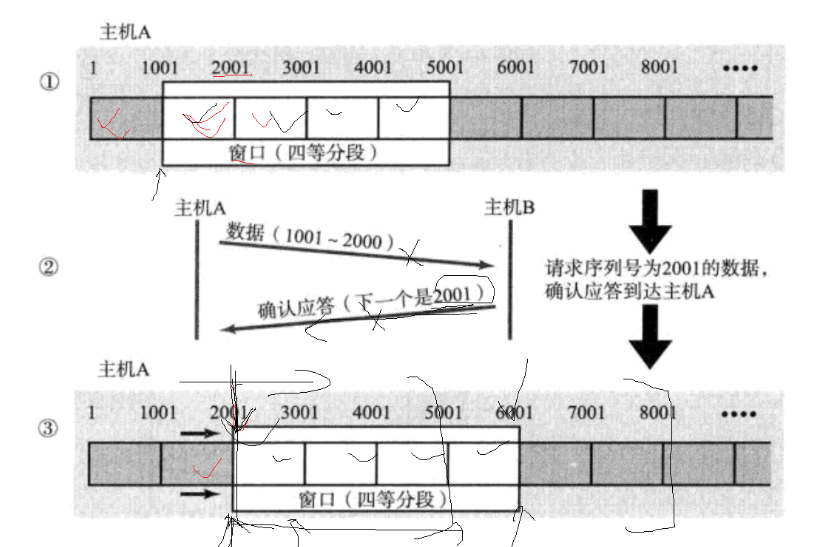当前发送端窗口容量是4000字节,前1000字节已完成发送,窗口移动到1000-5000;主机B ACK确认收到主机A的报文后滑动窗口向前移动,移动到2000-6000范围,剩余的6000往后的数据是未接收的数据。