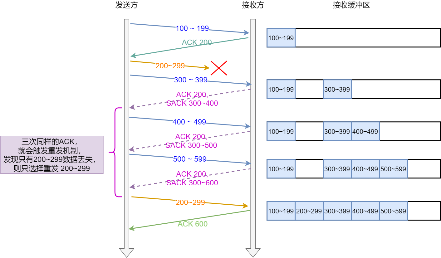 如发送方发出5份数据,第一份送到了返回ACK2,第二份因为其他原因没有收到,随着第三份第四份第五分数据收到了,因为前面没有收到第二份数据,所以返回ACK2,这样发送端收到了三份ACK2。知道了前面第二份数据可能有丢失,所以会在定时器过期前重新传第二份数据。最后收到了第三第四第五分数据,返回ACK6。