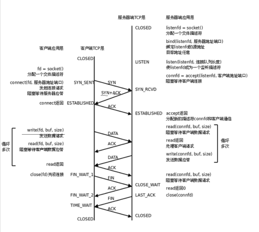 客户端socket创建套接字,connect绑定服务端端口;服务端创建套接字,bind绑定套接字,listen监听,accept接收客户端端口。随后系统会自主进行握手,connect和accept返回。