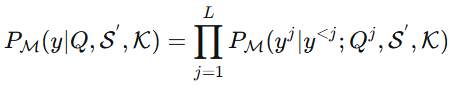 P_{\\mathcal{M}}(\\mathcal{Y}\|\\mathcal{X})=\\prod_{i=1}\^{\|\\mathcal{Y}\|}P_{\\mathcal {M}}(\\mathcal{Y}*{i}\|\\mathcal{Y}*{\